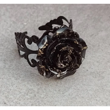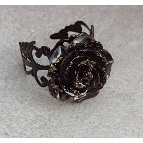 Unveil your dark elegance with our exquisite Black Rose Ring! Crafted with a stunning 16mm resin rose infused with shimmering gold flakes, this ring exudes a touch of mystery and luxury. Nestled atop an adjustable black filigree band, it offers both style and comfort for any occasion.