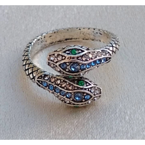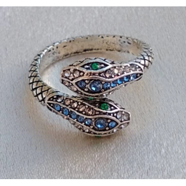 Slither into style with our mesmerizing Snake Ring! Crafted from durable alloy and featuring an adjustable band, this ring ensures the perfect fit for any finger. With two intricately detailed snake heads, each adorned with sparkling rhinestone eyes in striking blue, this ring exudes an air of mystery and allure. Additional blue and green rhinestones adorn the snakes, adding a pop of color and elegance to the design.