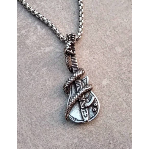 Unleash your inner rockstar with our stunning Guitar Necklace – a true masterpiece of style and symbolism! Featuring a captivating guitar pendant intricately detailed in antique silver, it's a tribute to music's timeless allure. And that's not all – a sleek snake elegantly wraps around the guitar, adding an edgy twist to the design. Crafted with precision from durable stainless steel, both the pendant and chain ensure long-lasting beauty and shine. ✨ With finely detailed fret boards and meticulous craftsmanship, this necklace is a must-have for music lovers and trendsetters alike.