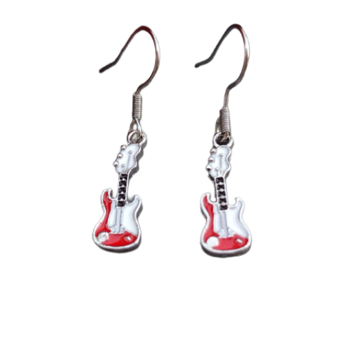 Get ready to rock your style with these Dainty Red and White Guitar Earrings! ???? Vibrant enamel paint in striking red and white hues brings these mini masterpieces to life, adding a burst of color to your look. ???? At just 3/4 inch, they're small but mighty in style! ???? Hung from durable stainless steel wire hooks, they're not only fab but also hypoallergenic for happy ears.