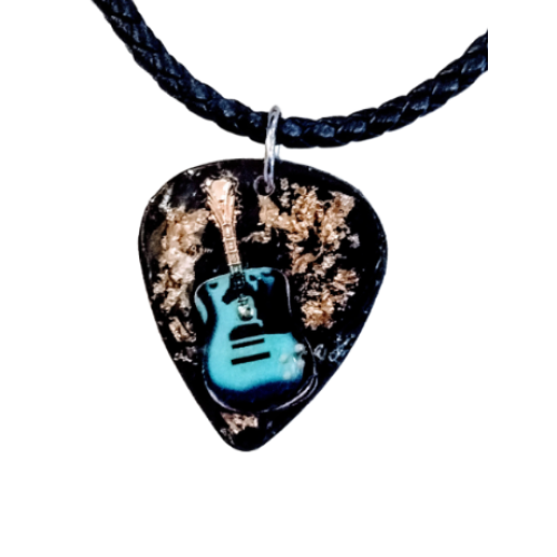 Strum your style with our exclusive Handmade Guitar Pick Pendant Necklace! Crafted from resin, this extraordinary pendant features a captivating blue guitar ensconced amid shimmering gold flakes against a bold black backdrop. Comes with a real leather necklace sized to order.